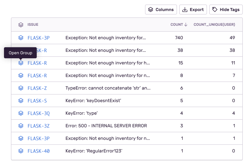 On each line item/issue, you can click on the issue name to open the Issue Details page and triage the issue. You can also click on the Open Group icon to continue querying through the events stack in the context of a specific issue.