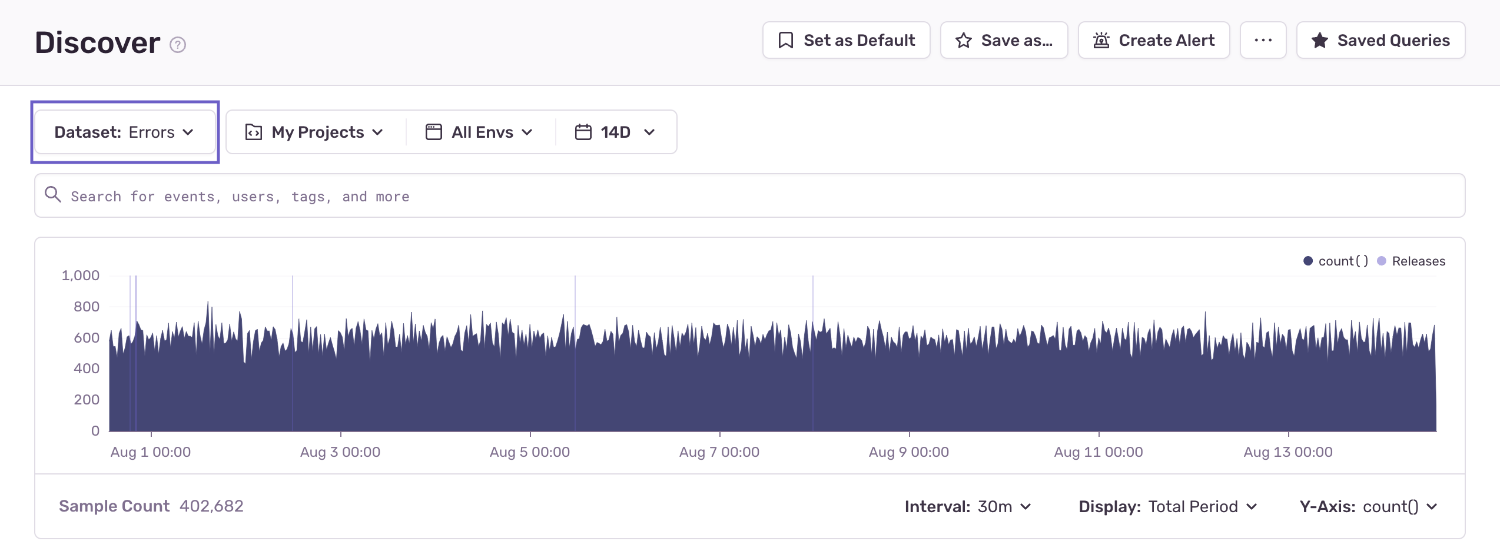 Sentry monitors different types of events for errors and performance. To query issues, select the "Errors" dataset using the Dataset dropdown.