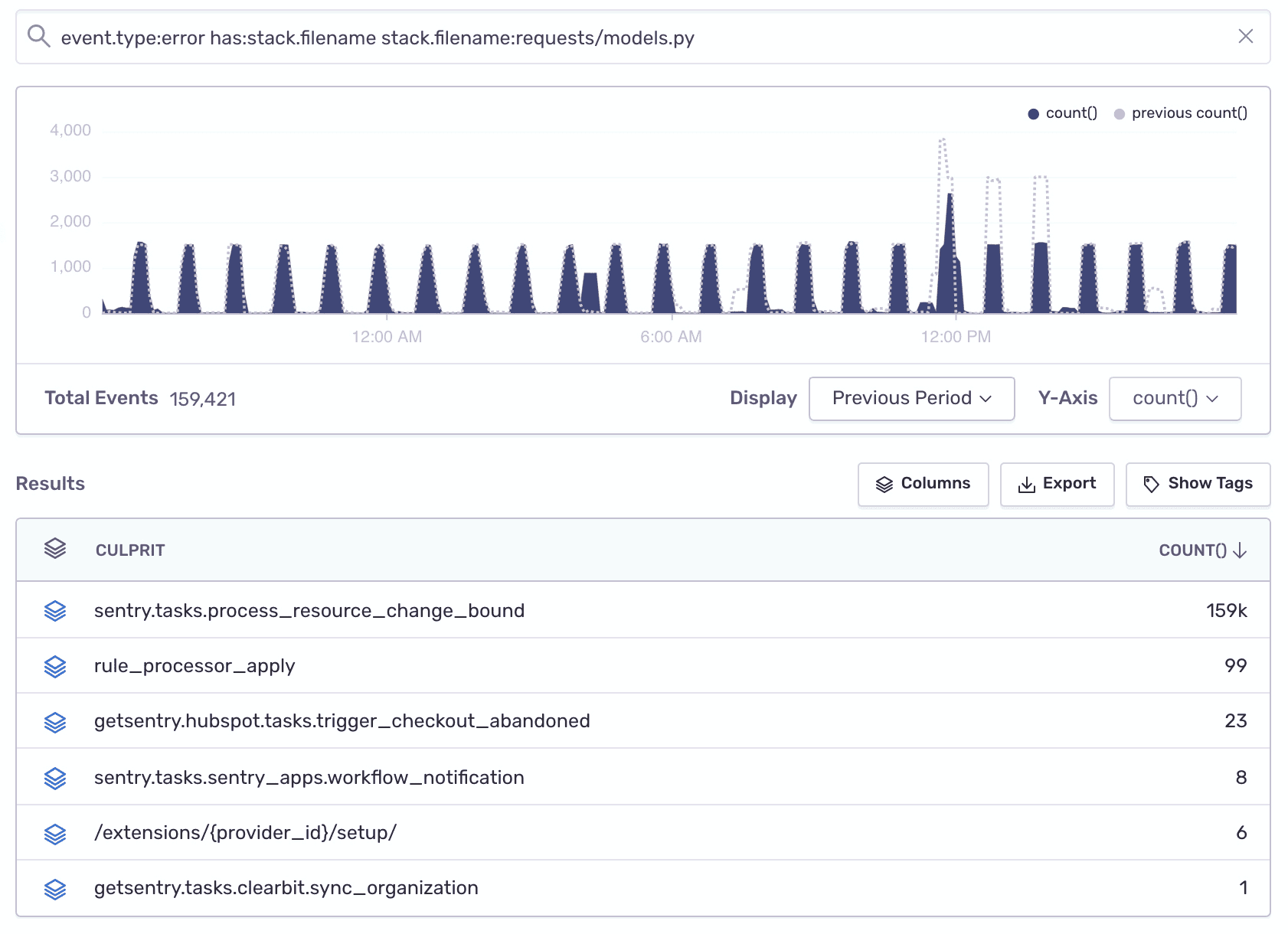 To find out which files in your codebase are generating the most errors, run the following query in Discover: