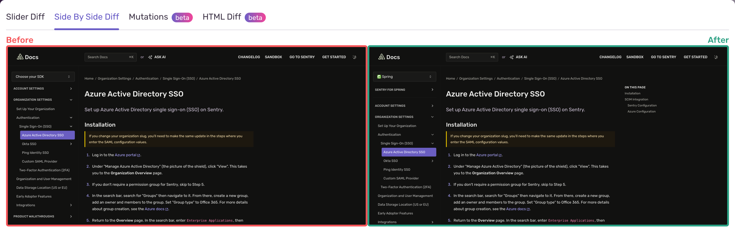 The image slider tool allows for comparing the two page states by overlaying the images on top of each other. Click and drag the purple line to reveal one image or the other.